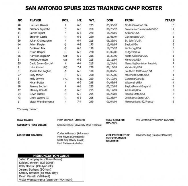 雷速体育9月30日讯 今日,NBA球队媒体日,马刺公布了训练营名单。