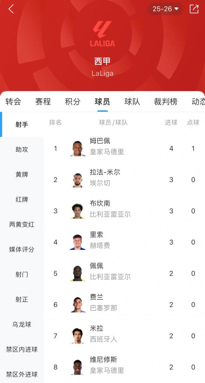 直播吧09月14日宣 西甲第4轮,皇马2-1战胜皇家社会,姆巴佩传射建功,他四轮打入4球领跑西甲射手榜。