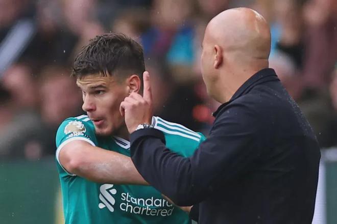 面对科尔科兹灾难级的上半场表现,主帅斯洛特在第38分钟就罕见地撤下这名新援左后卫,换上老成持重的罗伯逊。在下场时,斯洛特向这位新援做出了一定的解释,但年轻的科尔科兹显然不会开心。科尔科兹被换下的直接导火索是那次颇具争议的假摔。——吃到黄牌后,斯洛特担心他再冒失染红,于是果断换人。