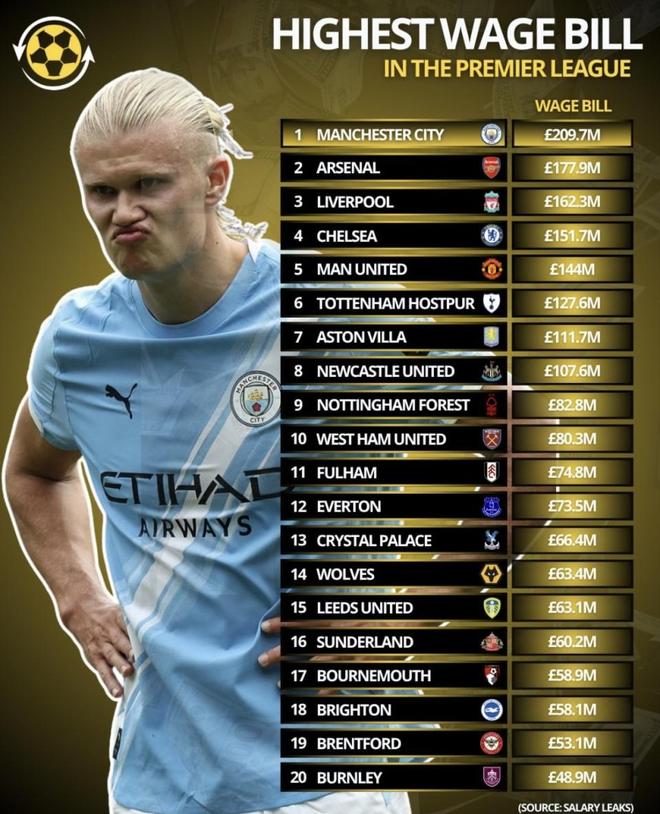 英超各俱乐部年度工资总额曝光!曼城19亿元利物浦15亿曼联13亿